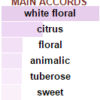 Mùi hương đậm chất hoa cỏ, toát lên sự nữ tính dành cho phái nữ và được tô điểm thêm với các nốt hương hoắc hương và hổ phách nồng nàn.